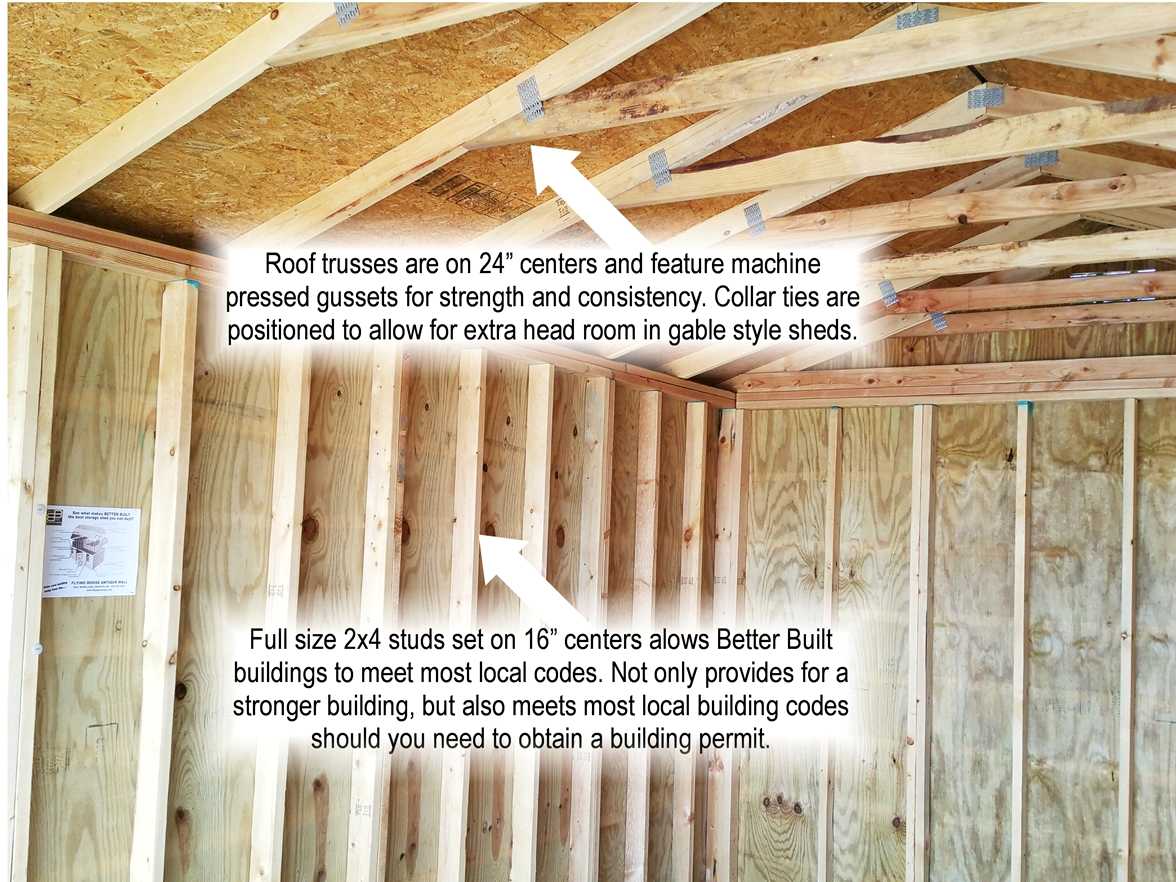 The standard 2x4 stud wall construction provides a solid exterior shell with numerous options for interior finishing and dividing. Many customers have added divider walls to create seperate workshop and storage areas, or multiple mini-storage units!